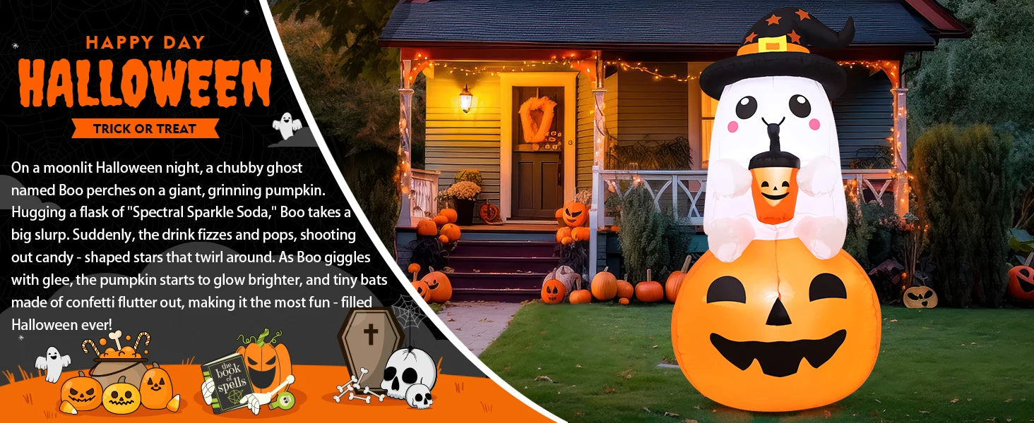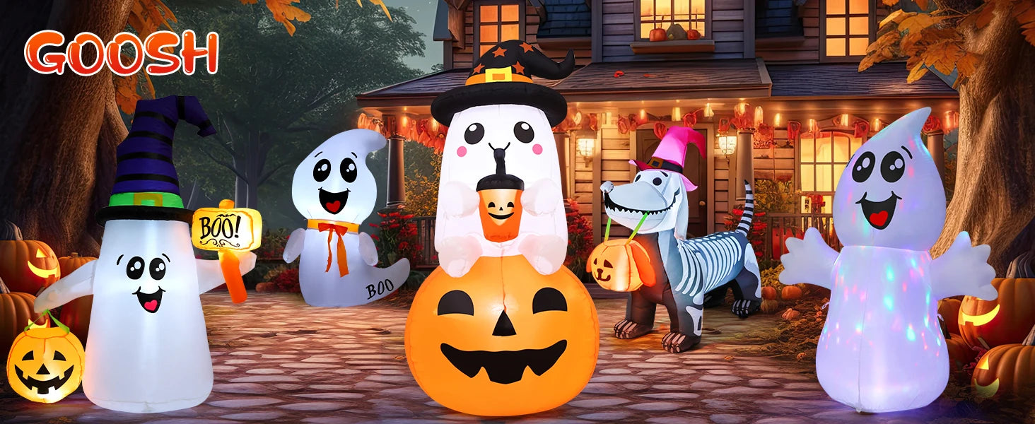 Bring spooky fun to your Halloween with the Inflatable Halloween Ghost by GOOSH. Designed for adults and outdoor use, this ghost features a glowing LED light, making it an eye-catching decoration for parties, yards, or events. Its pumpkin-shaped design adds a classic Halloween touch, while the durable PVC construction ensures it withstands seasonal outdoor setups.